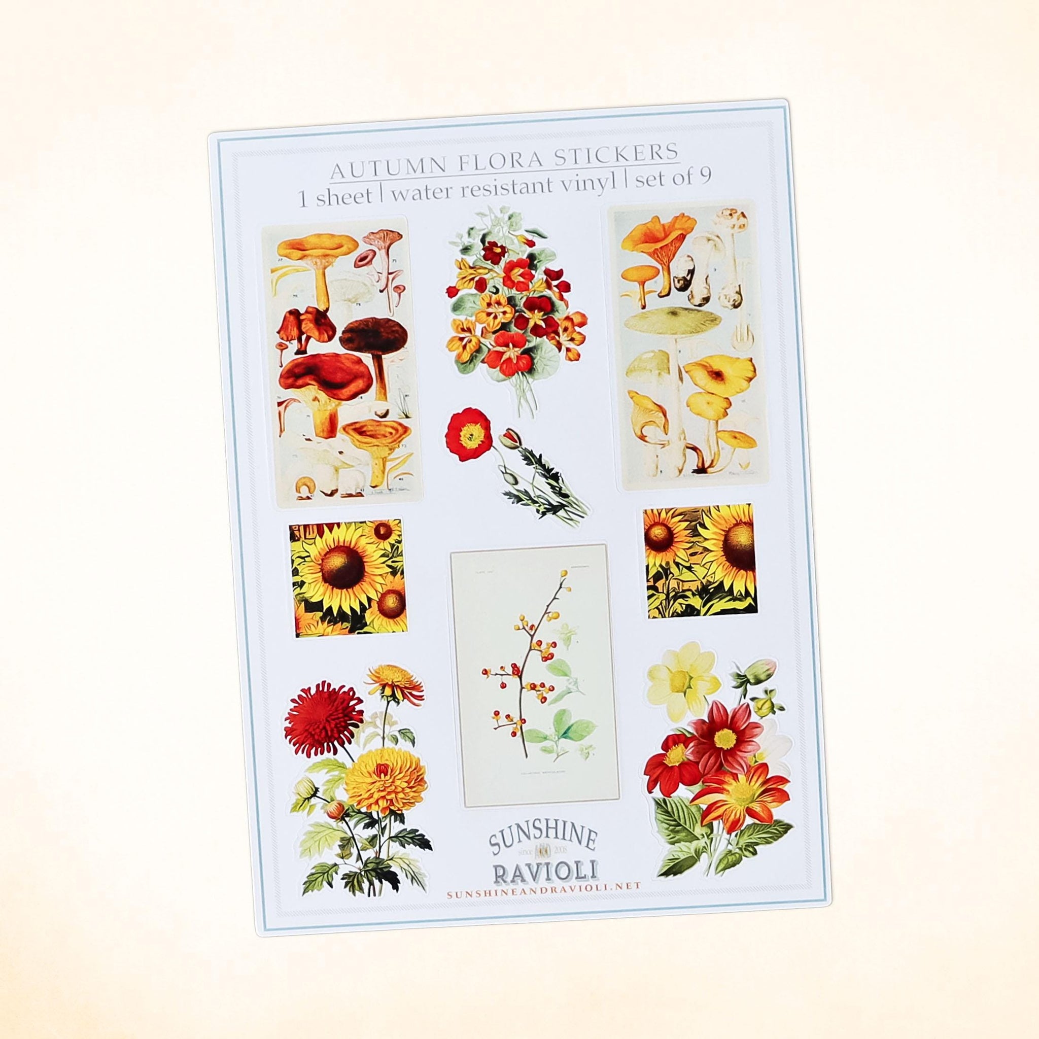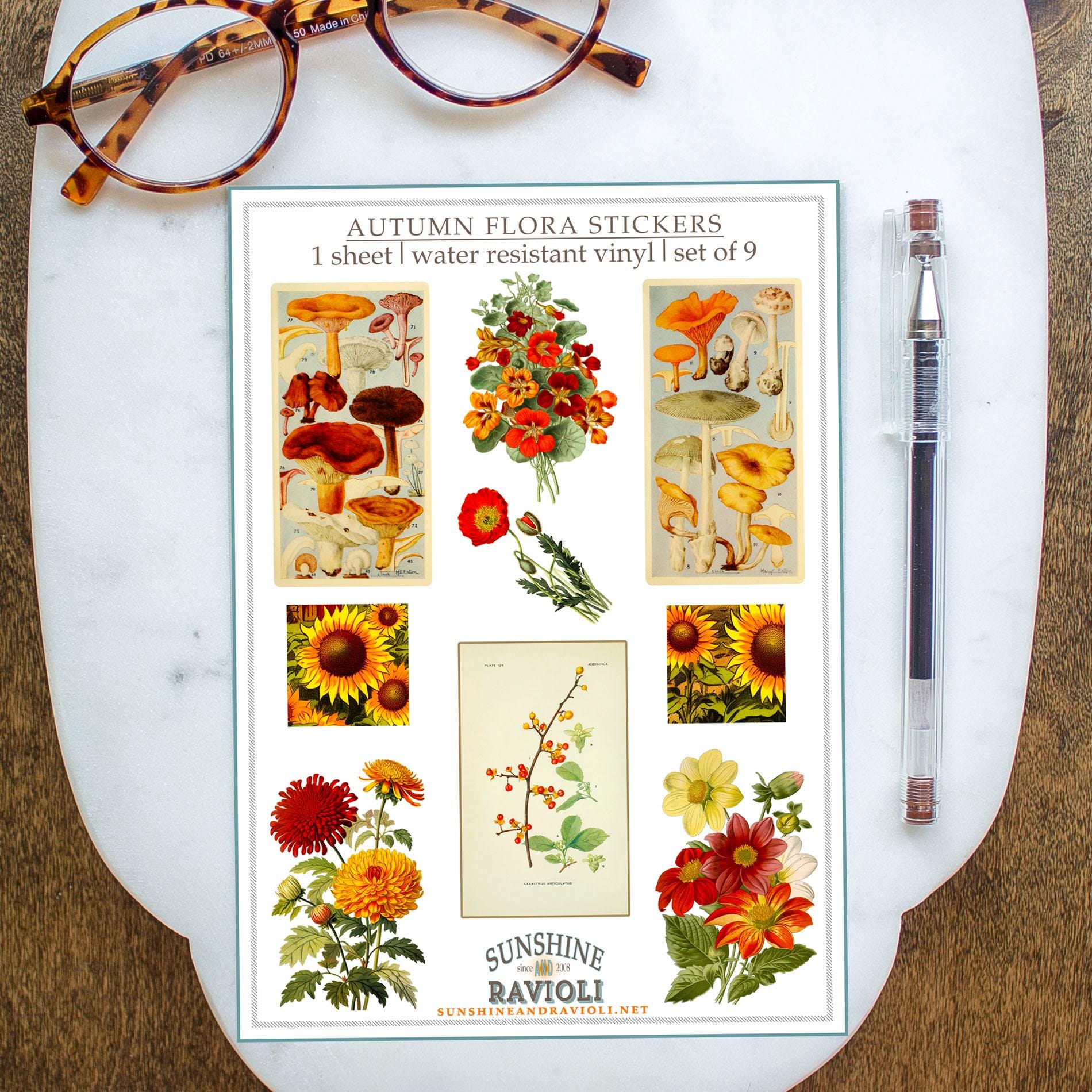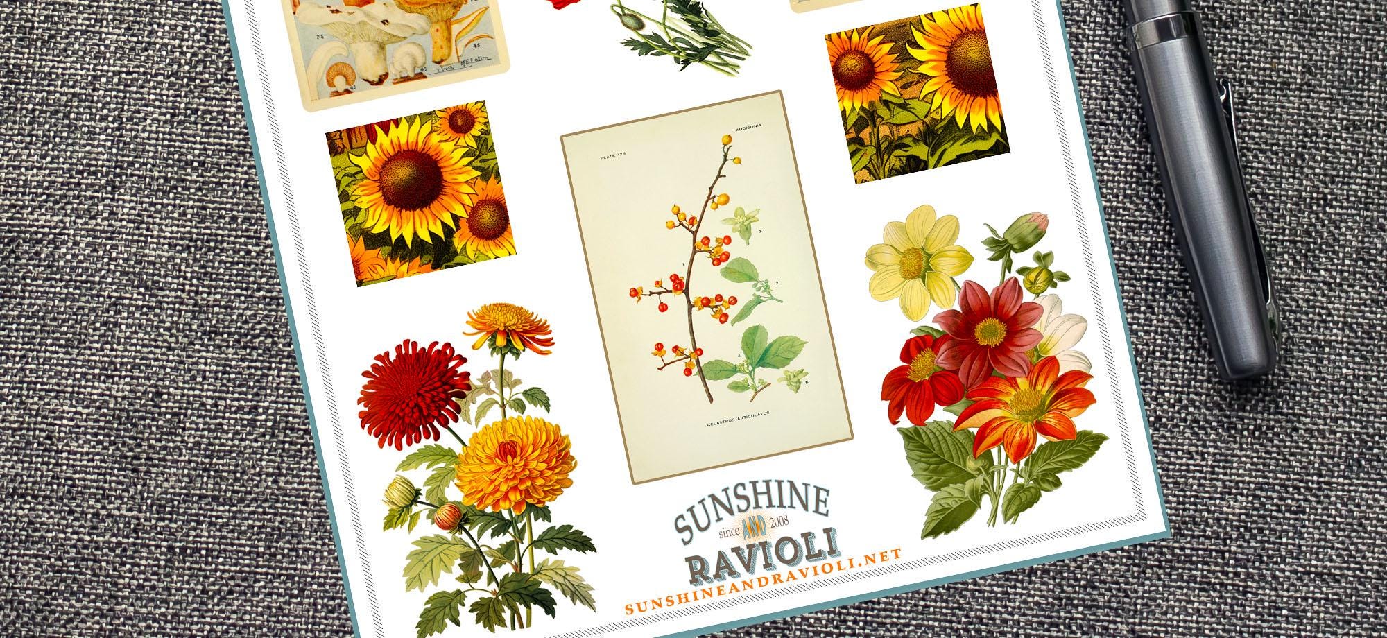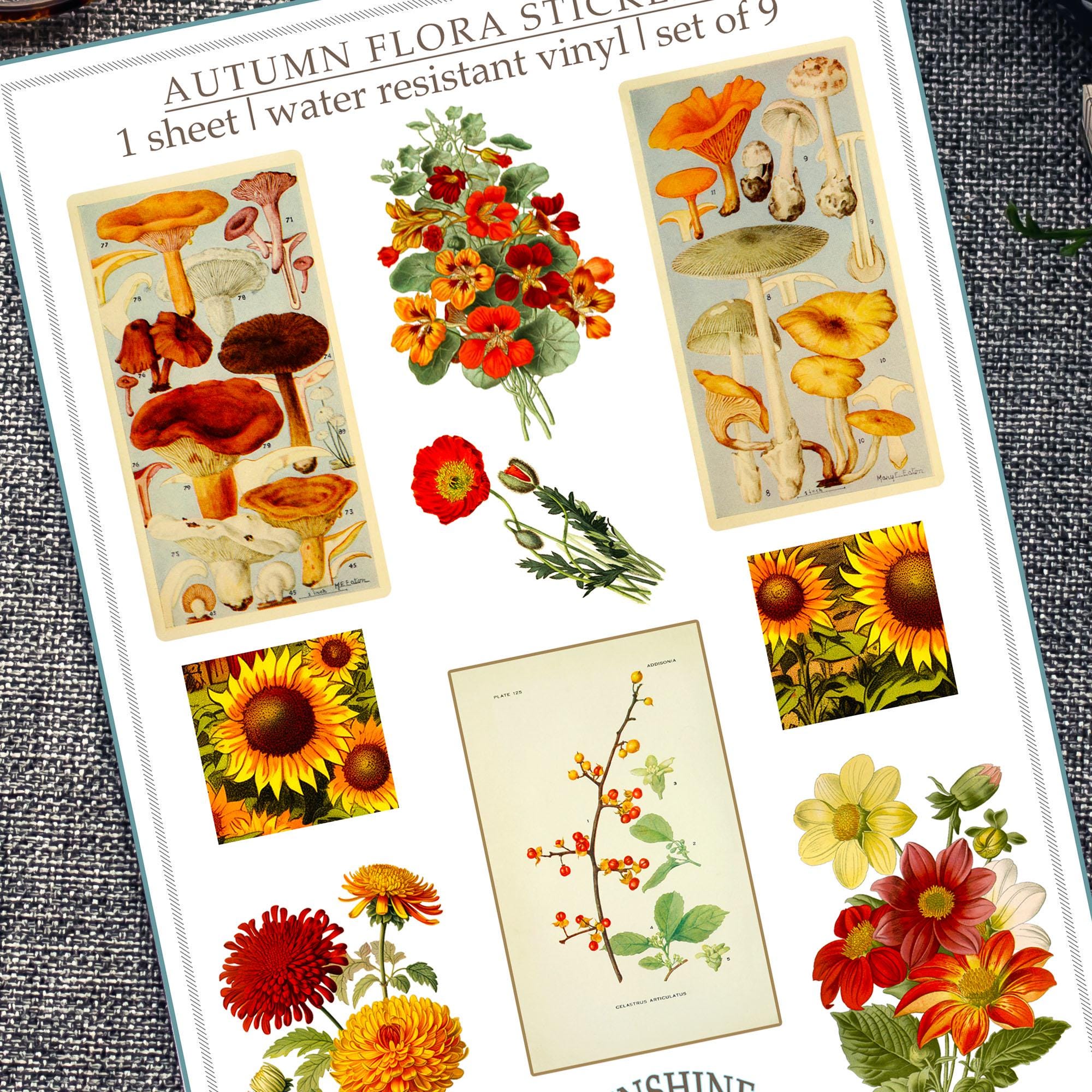 Celebrate the rich colors and textures of fall with this vintage-inspired sticker sheet featuring charming botanical and mushroom illustrations.