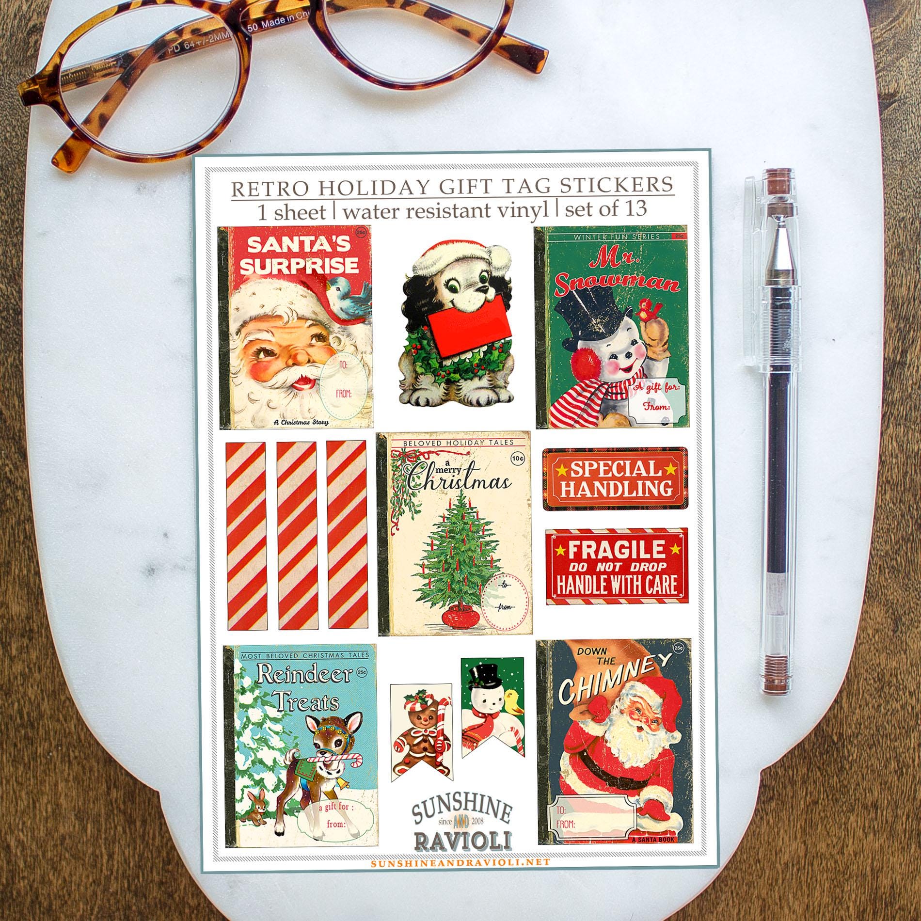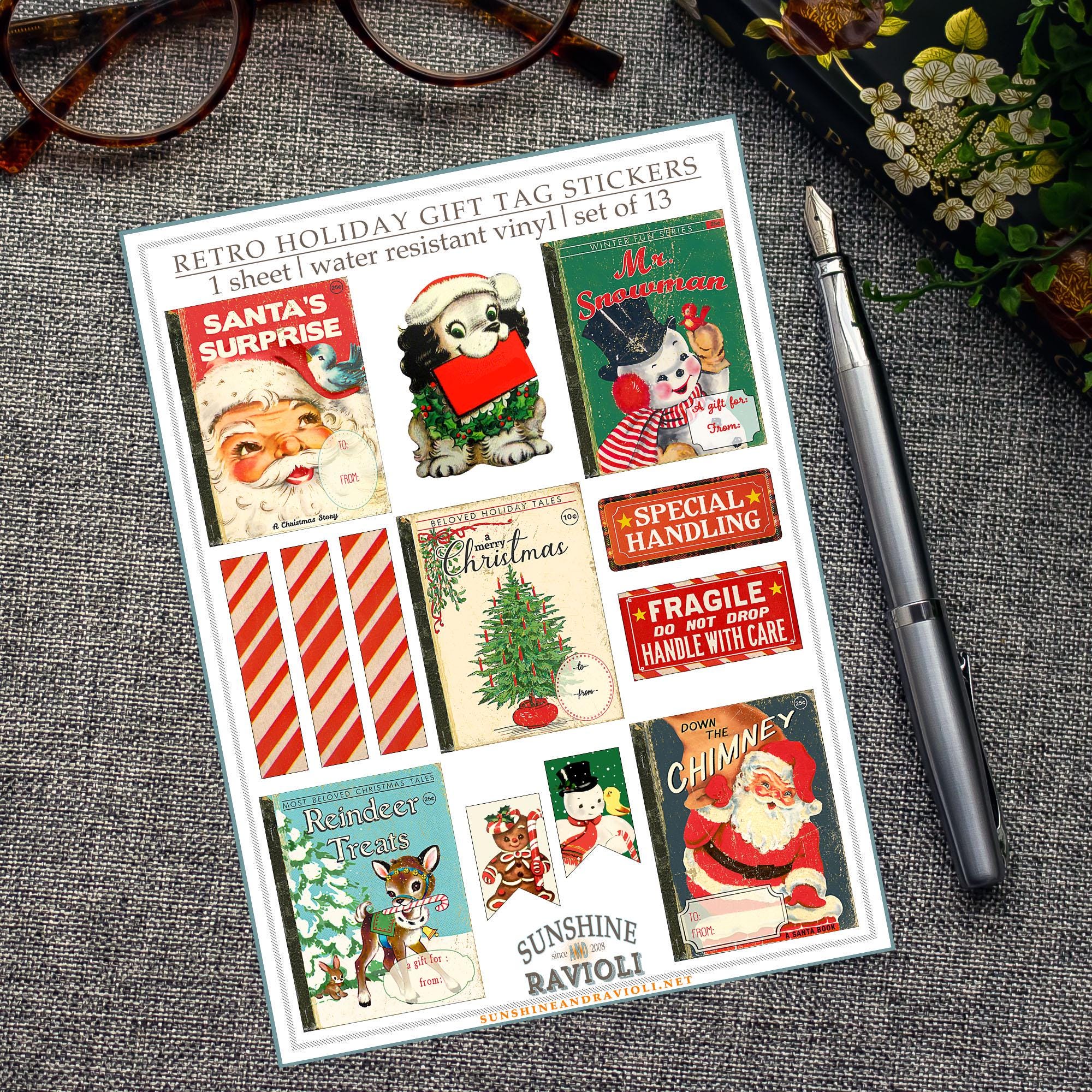 This cheerful holiday sticker sheet features 13 vintage-inspired gift tag designs — from classic Santas and reindeer to candy stripes, snowmen, and ā€œfragileā€ labels. Printed on matte water-resistant vinyl, they’re perfect for giving packages that charming midcentury touch.